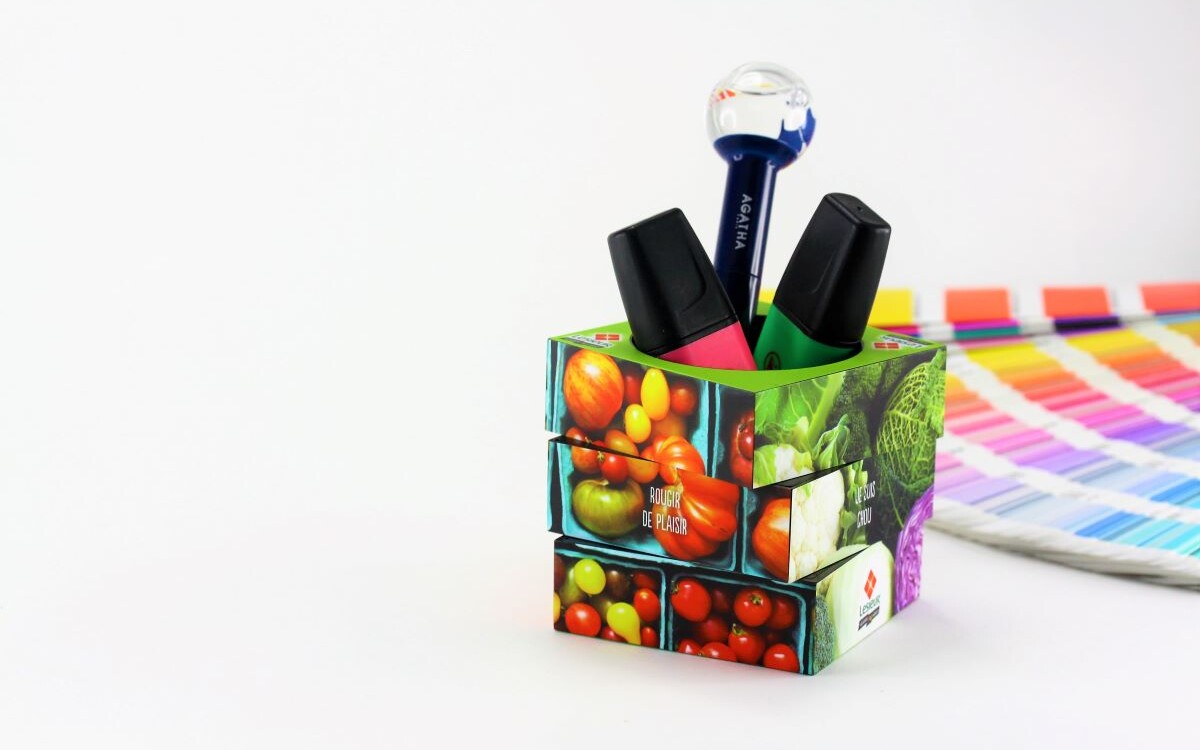 Volledig te personaliseren aan alle 6 zijden en uitgerust met twee magnetische rijen voor het netjes opbergen van paperclips.