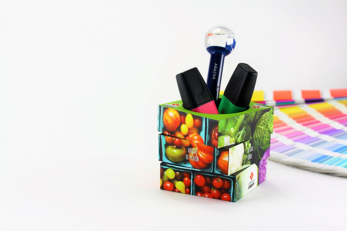 Volledig te personaliseren aan alle 6 zijden en uitgerust met twee magnetische rijen voor het netjes opbergen van paperclips.