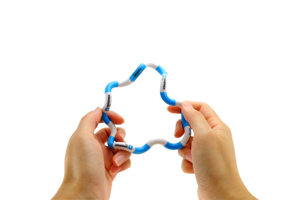 De promotionele Tangle® wordt gemaakt van gerecycled materiaal en ontworpen voor hergebruik.